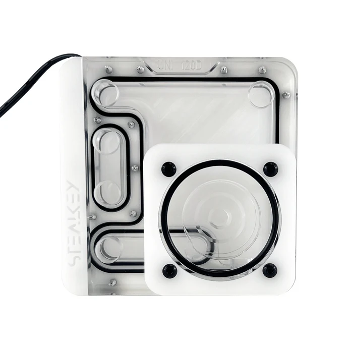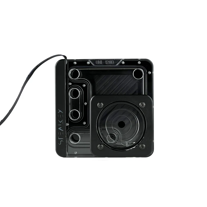 The Stealkey Customs UNI 120D is a custom distro-plate designed to serve as a reservoir, coolant routing, and pump solution for any case with a 120 mm fan mounting.
